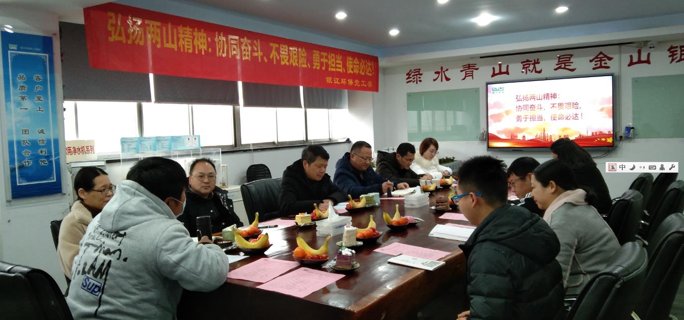 “弘揚兩山精神:協同奮斗、不畏艱險、勇于擔當、使命必達”。2021年1月24日,杭州銀江環保科技有限公司承建武漢火神山、雷神山醫院應急污水處理整套裝備一周年之際,召開了回顧“兩山”建設,弘揚“兩山”精神專題茶話會。由戰“疫”先鋒隊員參加該會議,邀請嘉賓有西湖區古蕩街道數益商圈黨支部袁書記、時代光華培訓總監林學勤老師、公司顧問徐老師。